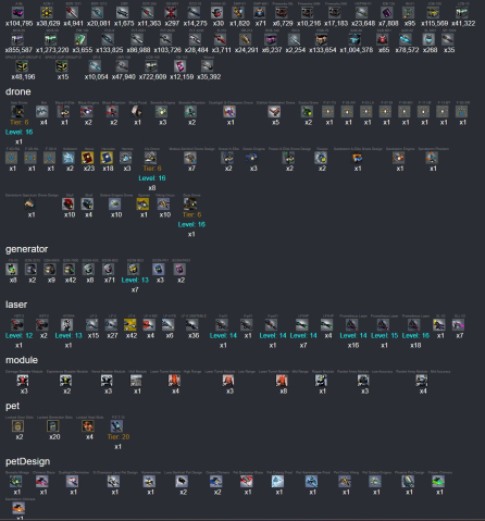 | 3188 Diametrion, 1100 IAC, 2700 ABR, 684 I_Oil, 89k Rinusk, 704 Trace, 16k Aurus, 304 Schizm, 545 Cerebrum, 339 Scrap, 9k Eternal frag