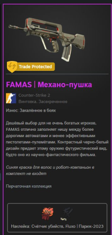 Краткое описание: ✅FAMAS | Механо-пушка✅ЗАКАЛЕННОЕ В БОЯХ✅【ГАРАНТИЯ】🔥【БЫСТРО】🔥✅НИЖЕ АВТОПОКУПКИ✅ТОП НАКЛЕЙКИ✅