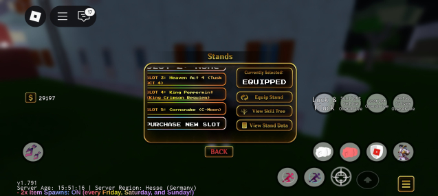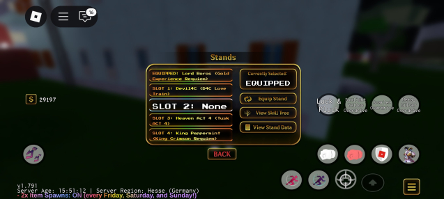 YBA- активный стенд Lord Boros (GER), DevilD4C, Heaven Act ( Tuck act 4), King Pepeermint (KCR), CornSnake ( C-Moon) имеются лимитки Cursed Scythe, Cyber Scythe Lucky Mask, Lucky arrow