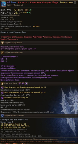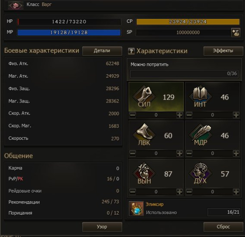 Шмот: перчи багровые +5 ( 2% от ближ оружия и крит -11%), шлем ветра +5 ( сопротивление 10%), верх лайт защиты +7 ( 12.5 %), низ лайт защиты +7, сапоги уклонения +6 ( 4%), символ берса +5 ( -7%), камни в шмотках все 18. Благ кастеты льда +7 (+5 мощ умений и 2 % к соскам). Венец +9 ( 300 к криту), маска фантома +9, маска пробивания +8, небесный плащик, благ пояс +8, подвеска ГК. Эпик распеч только ацтакан +2, запечат: закен +2, ак +3, баюм+3, фринта +3, кольца ядра +2 (2), орфен +2. Краски 21 21 21 21, скрытая 5 12 11 19. Браслеты и брошь 8, камни все 7, агатионы петрам 10, небула 10, радость 10, игнис 9, яйцо 9. Талики баюм +5 ( в вх +4), небесный +8, благ власть +8, благ скорость +9, благ ева +8, ада +10, аден +8, бенир 28 ( 9 траев на 30, но нет )) Колекция закрыта на 94%, куклы 58%. АА 120к+, руды 5кк +, в вх куча всякого
