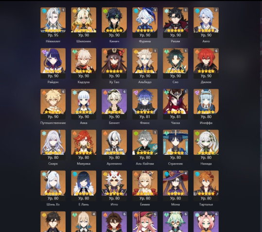 Ху Тао, Нёвиллета, Аято, Странника, Клоринды, Е Лань, Гань Юй, Дилюка, Венти(самого Венти нет)