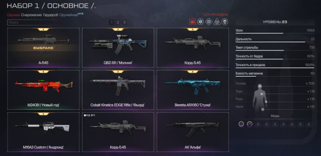✅ Штурмовик: A-545 (2 мода) || Berreta ARX160 " Стужа" (3 мода) || М16А3 Custom " Андроид " (1 мод) || Корд-5.45 (1 мод) || QBZ-191 " Молния " (1 мод) || Cobalt Kinetics EDGE Rifle " Фьорд " (1 мод) || М240В " Новый год"