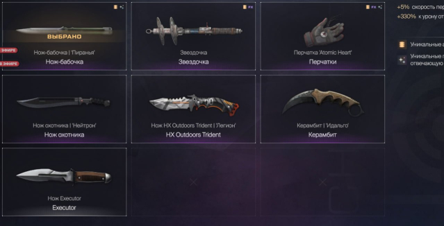 📍Ножи — бабочка пиранья, бабочка панда, звездочка, перчатки атомик, нож охотника, керамбит идальго.