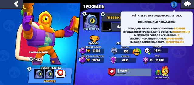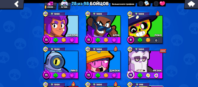 📅 Создан в 2023 | 🔥 198 скинов | 💪 78/98 бравлеров (17 на 11-й силе)