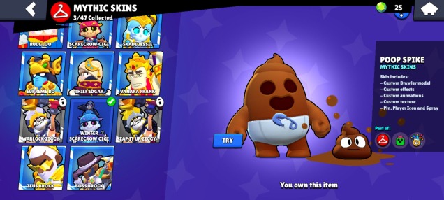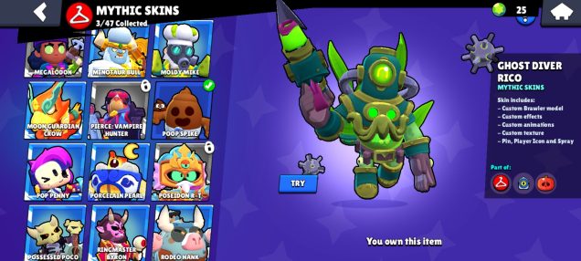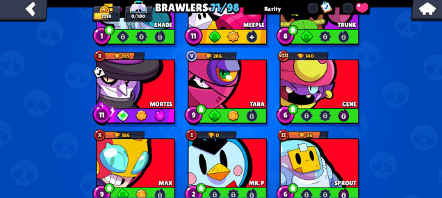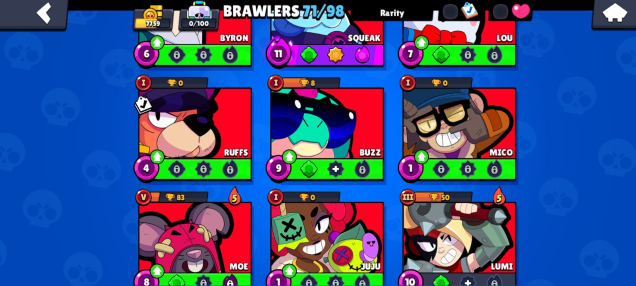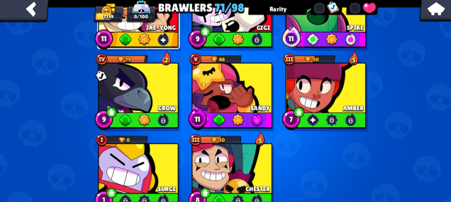 Подробное описание: на аккаунте имеется 71 бравлер, среди которых 6 легендарных.