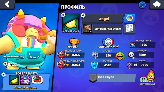 Краткое описание: ✅[Быстрая ВЫДАЧА] 🏆 26027 Кубков 💫 76 Бравлеров 💎 4 Гемов ✅ Тег: #GRYRPY9Y9