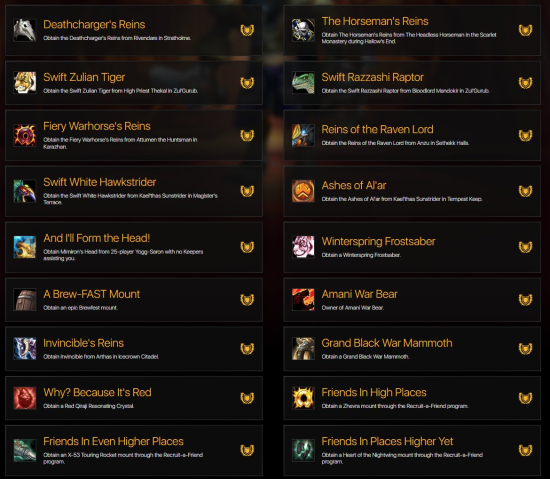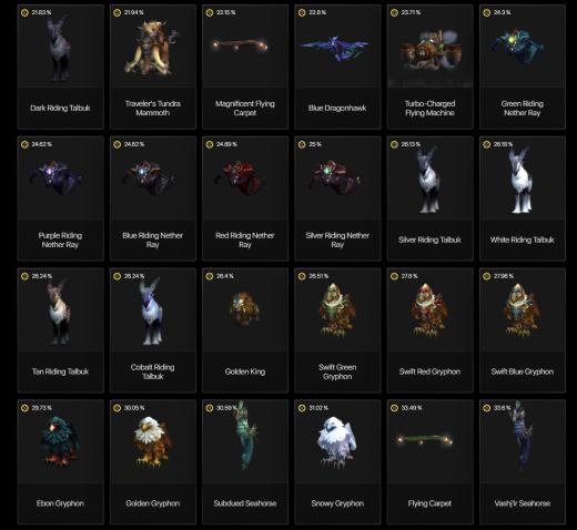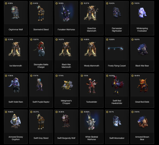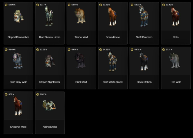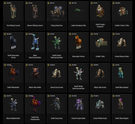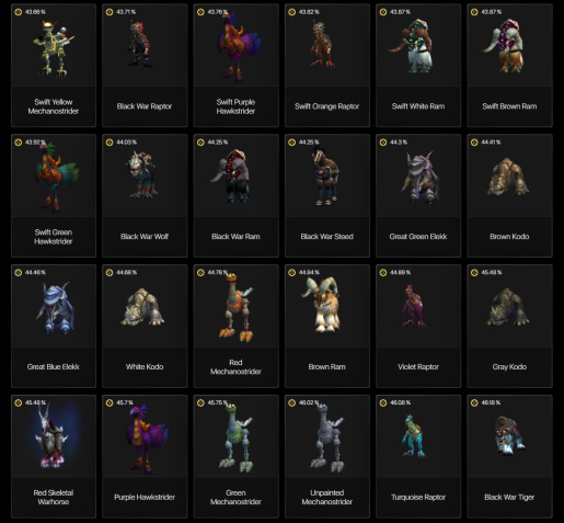 На аккаунте много редких маунтов, которых уже не получить в игре. Два из которых входят в топ 15 и топ 23 недоступных маунтов в игре (Белый боевой конь крестоносца и Стремительный скакун). Всего 150+ ездовых животных.