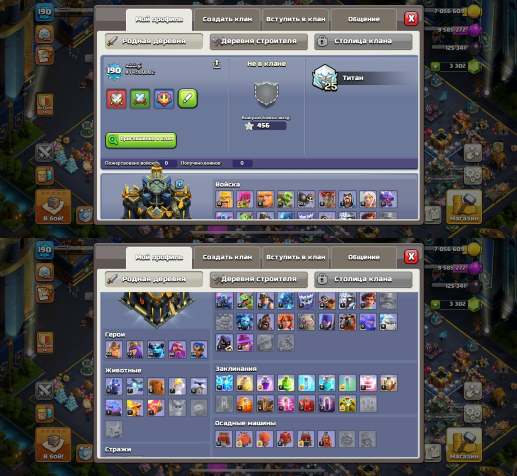 Уровень Ратуши: 17Краткое описание: 🎮Быстрая ВЫДАЧА💚ЖИР🏰17 ТХ + 10 ДС💎3300 ГЕМОВ⭐190 ЛВЛ🦸ГЕРОИ: 63/72/56/60/28