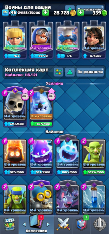 Краткое описание: 8000🏆 | 🏟️21 АРЕНА | 📈46 ЛВЛ | 🃏118/121 КАРТ | 🗼3 TOWER СКИНОВ | 🔥51 ЭМОДЗИ | 🦸1 ГЕРОЙ | 💜10 EVO