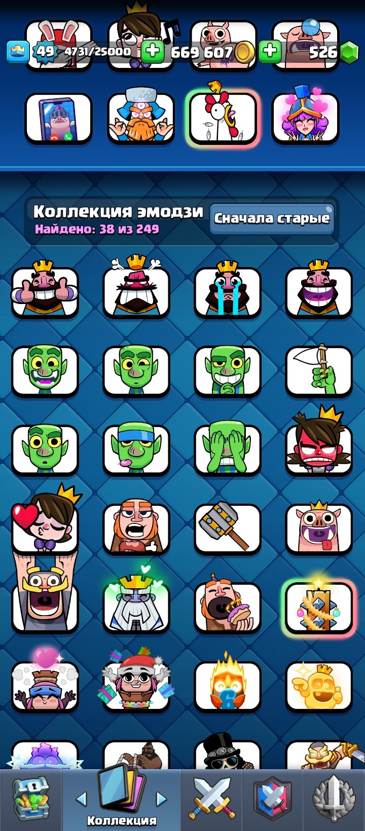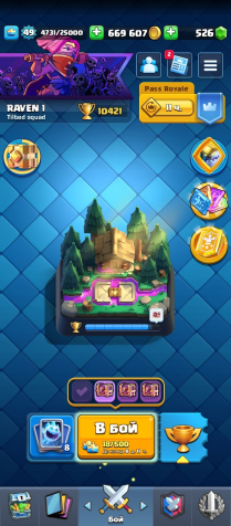 Ресурсы: Огромный запас золота (669,000+), которого хватит на прокачку нескольких новых карт до максимума, и 526 кристаллов.