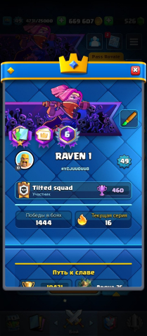 Статистика: Число побед — 1444, текущая серия — 16. Аккаунт находится в активном клане «Tilted squad».