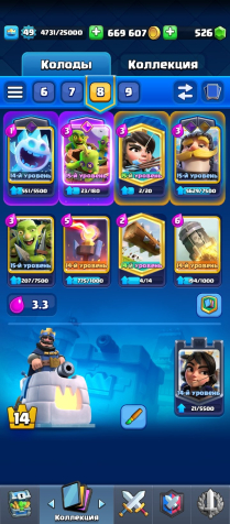 Основная колода: Идеально выкачанный Log-Bait (3.3). Гоблинская бочка, Принцесса, Рыцарь и Гоблинская банда уже на 15 уровне (Elite). Остальные карты — 14 уровня.