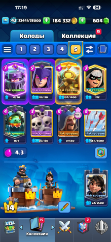 15 лвл мега рыцарь, минипекка,14 лвл армия скелетов, ведьма, стрелы(перечислил тех, кто в колоде) остальные +- 12-13 лвла