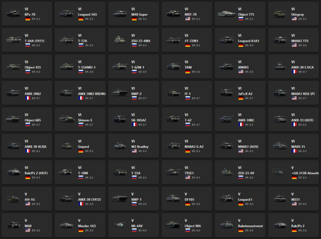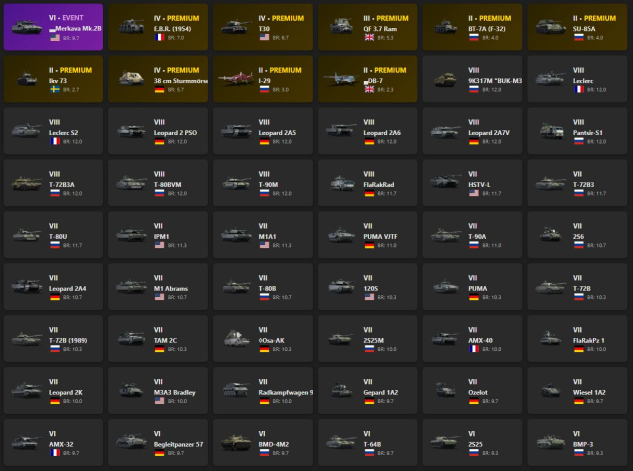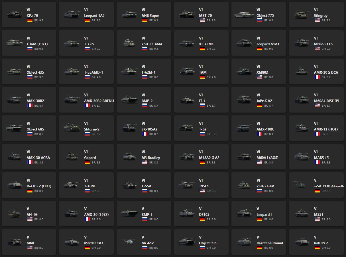 ▃Merkava Mk.2B, E.B.R. (1954), T30, QF 3.7 Ram, BT-7A (F-32), SU-85A, Ikv 73, 38 cm Sturmmörser, I-29, ▄DB-7, 9K317M «BUK-M3» (TADS), Leclerc, Leclerc S2, Leopard 2 PSO, Leopard 2A5, Leopard 2A6, Leopard 2A7V, Pantsir-S1, T-72B3A, T-80BVM, T-90M, FlaRakRad, HSTV-L, T-72B3, T-80U, IPM1, M1A1, PUMA VJTF, Т-90А, 2S6, Leopard 2A4, M1 Abrams, T-80B, 120S, PUMA, T-72B, T-72B (1989), TAM 2C, ◊Osa-AK, 2S25M, AMX-40, FlaRakPz 1, Leopard 2K, M3A3 Bradley, Radkampfwagen 90, Gepard 1A2, Ozelot, Wiesel 1A2, AMX-32, Begleitpanzer 57, BMD-4M2, T-64B, 2S25, BMP-3, KPz-70, Leopard 1A5, M48 Super, MBT-70, Object 775, Stingray, T-64A (1971), T-72A, ZSU-23-4M4, ◊T-72M1, Leopard A1A1, M60A3 TTS, Object 435, T-55AMD-1, T-62M-1, TAM, XM803, AMX-30 S DCA, AMX-30B2, AMX-30B2 BRENUS, BMP-2, IT-1, JaPz.K A2, M60A1 RISE (P), Object 685, Shturm-S, SK-105A2, T-62, AMX-10RC, AMX-13 (HOT), AMX-30 ACRA, Gepard, M3 Bradley, M48A2 G A2, M60A1 (AOS), MARS 15, RakJPz 2 (HOT), T-10M, T-55A, T95E1, ZSU-23-4V, ◄SA 313B Alouette II, AH-1G, AMX-30 (1972), BMP-1, DF105, Leopard I, M551, M60, Marder 1A3, Mi-4AV, Object 906, Raketenautomat, RakJPz 2, SPz BMP-1, T-54 (1949), T-54 (1951), AMX-13-90, AMX-50 (TOA100), AMX-50 Surbaissé, IS-4M, Lorraine 40t, M103, M48A1, M48A2 C, Marder A1-, Maus, T-54 (1947), T32E1, ZSU-37-2, AMX-50 Foch, BTR-80A, IS-3, M163, M47, T32, Wiesel 1A4, ZSU-23-4M2, 2S19M1, Object 268, T-44-100, T95, ZSU-57-2, SU-122-54, AMX M4, AMX-13, M46, Panther II, T92, Tiger II (10.5 cm Kw.K), Ferdinand, IS-2 (1944), Jagdtiger, Kugelblitz, leKPz M41, M26, M50, M56, Ratel 90, T-44, T26E1-1, T26E5, T34, Tiger II, Tiger II (Nr.1-50), 2S3M, ASU-85, Charioteer Mk VII, IS-2, Jagdpanther G1, JPz 4-5, M-51, M41A1, M4A3E2 (76) W, SU-100P, T25, 2S1, CA Lorraine, Centurion Mk 1, Panther A, Panther F, Panther G, R3 T20 FA-HS, SU-100, ISU-122S, T-34-85, M18 GMC, Tiger E, IS-1, M4A3 (76) W, M4A3E2, Panzer IV/70(V), Tiger H1, Waffenträger, ▄M4A3E2, ARL-44, Challenger, Comet I, ISU-122, M36 GMC, M4A2 (76) W, Nashorn, Ostwind II, Panther D, PT-76B, T-34-85 (D-5T), AMX-13 DCA 40, KV-85, M4A1 (76) W, M4A4 (SA50), M6A1, SU-85M, VK 3002 (M), Avenger, Churchill VII, Concept 3, ISU-152, KV-1 (ZiS-5), Sherman Firefly, T-34-57, AMX-13 (FL11), ASU-57, Jagdpanzer 38(t), Jagdpanzer IV, SU-85, 8,8 cm Flak 37 Sfl., Churchill III, M19A1, M42, SU-152, ␗T-34 (1943), 90/53 M41M, ARL-44 (ACL-1), M42 Contraereo, Wirbelwind, Ostwind, KV-1S, M4A2, StuG III G, Sturer Emil, T-34 (1941), T-34 (1942), T-34E STZ, AEC AA, Cromwell I, Dicker Max, KV-1 (L-11), KV-2 (1939), M24, M4, Pz.IV H, Pz.IV J, SARC MkVI (6pdr), Sd.Kfz.234/2, Sherman II, ␗M4A4, Achilles, Churchill I, Cromwell V, M10 GMC, M4A1, P40, Pz.III M, Pz.IV F2, Pz.IV G, Sd.Kfz.251/21, StuG III F, T-34 (1940), YaG-10 (29-K), ZiS-12 (94-KM), ZSU-37, ␗M10 GMC, ▄M10 GMC, ▄M4A1, Crusader AA Mk I, Crusader III, Gun Carrier (3-in), M4A3 (105), Marder III H, Pz.III L, StuH 42 G, Valentine IX, Yak-1B, ZiS-43, AB 43, Archer, BTR-152A, Crusader II, M15/42, M16 MGMC, M3 Lee, M5A1, Matilda III, Pz.III J1, SU-122, SU-57B, T-50, Valentine I, Valentine XI, Yak-7B, ␗M3A3 Stuart, ␗M5A1, 75/32 M41, 75/34 M42, B1 bis, CCKW 353 (M45), CCKW 353 AA, GAZ-MM (72-K), LaGG-3-35, LVT(A)(4) (ZiS-2), SARC MkVI (2pdr), T-28E, T-80, Yak-1, ZiS-30, ␗Chi-Ha Kai, 75/18 M41, LaGG-3-8, Spj fm/43-44