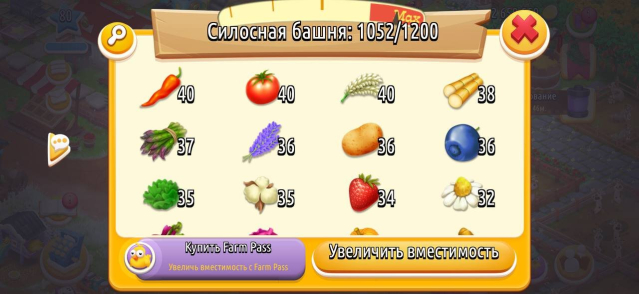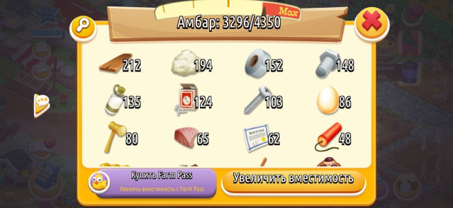 🌿 Амбар — 4350 вместимости (из них 3300 забито ресурсами)