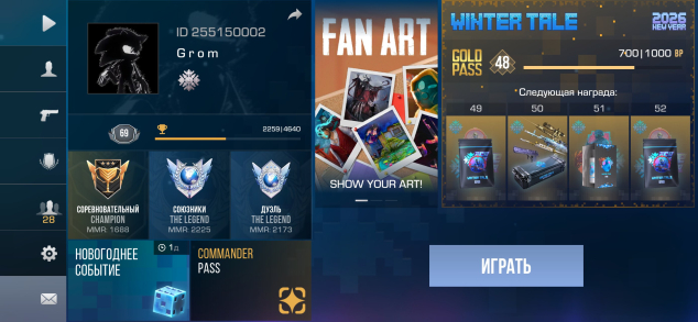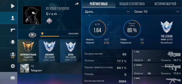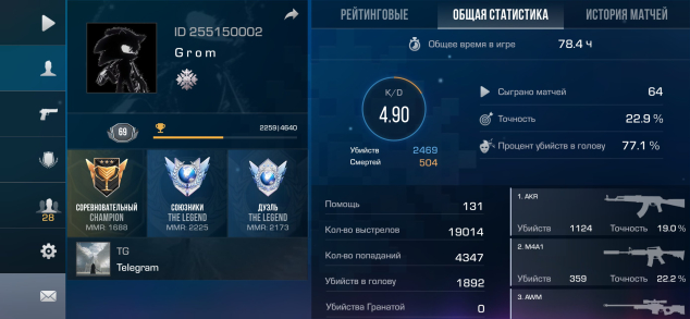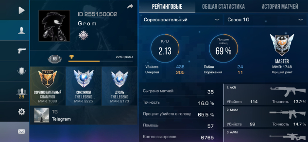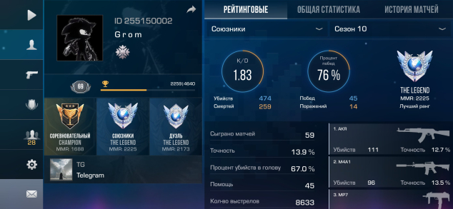 Звание: LegendКраткое описание: 🩸Красивый ID 255150002🕷️5КД в общей статистике🕷️69 лвл🕷️1 нож🕷️200 голды🩸