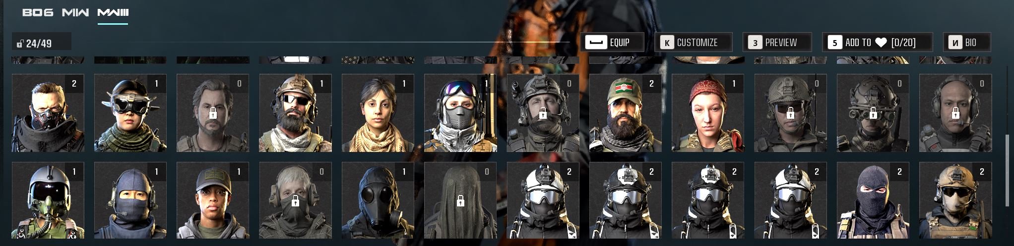 MW3 (24/49): Woods (Zombie + Numbers), Makarov Dominus, Banshee Blood Red Riding Hood, Rick Grimes, Dokkaebi, Swagger + Akuma, CDL Male/Female Full Set (Home, Away, Gold, Platinum).