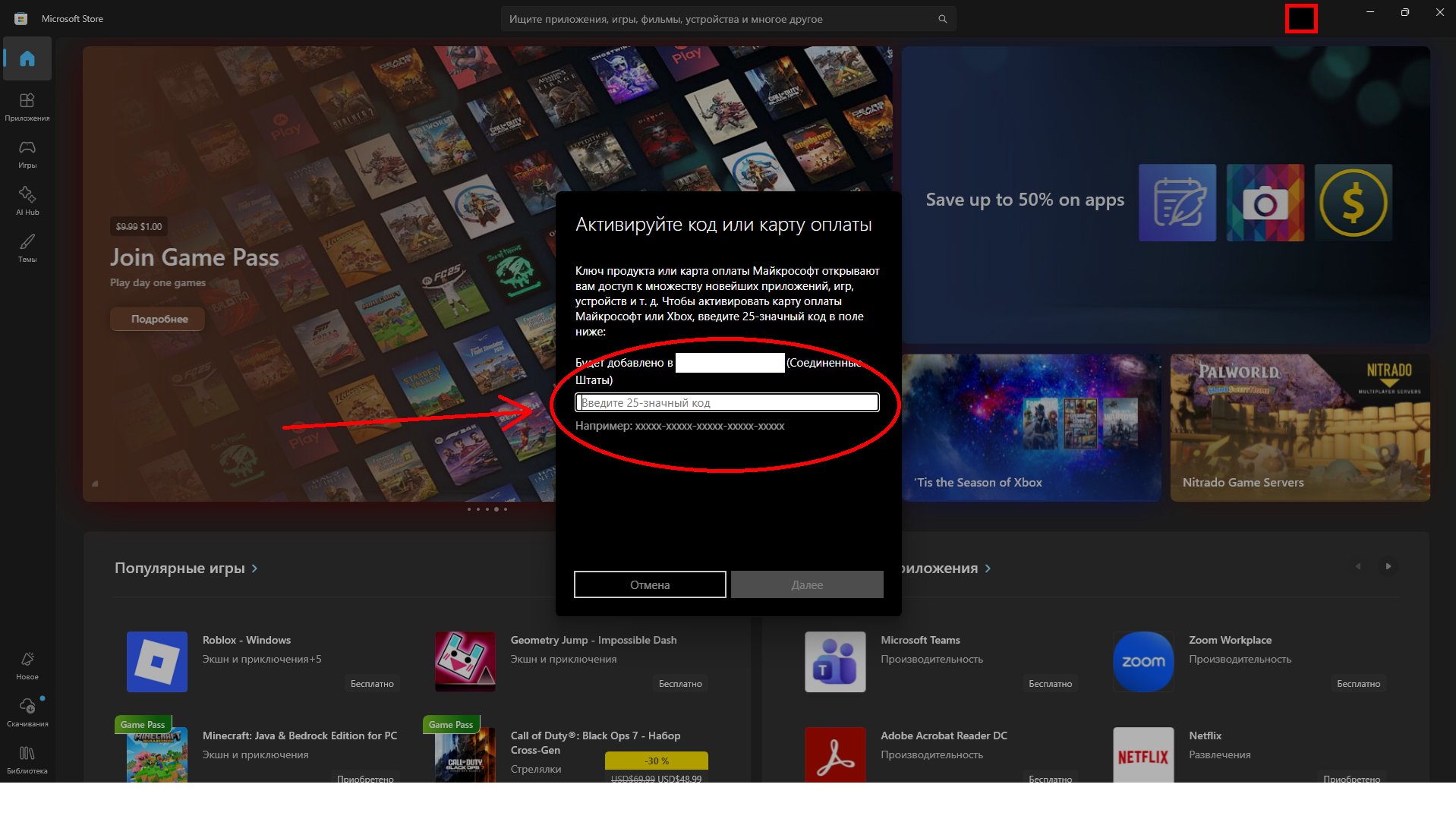 4. Введите 25-значный код и нажмите «Далее», чтобы привязать контент к вашей учетной записи Microsoft.
