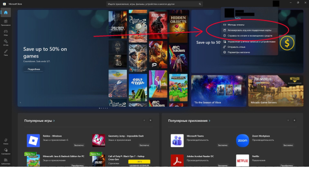 3. Нажмите на «Учетная запись» в правом верхнем углу и выберите опцию «Активировать код или подарочную карту».