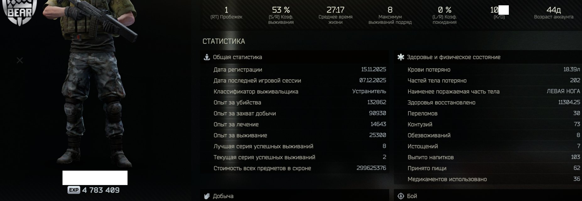 52 лвл BEAR, сделаны все квесты на Каппа контейнер, прокачены полезные навыки до уровня Elite, прокачано убежище.