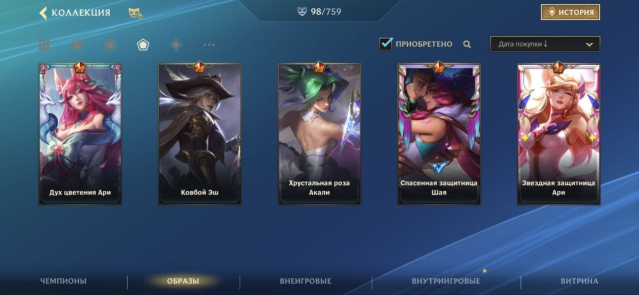 На акаунте присутсвует три лимитированых облика: Спасённая защитница Шая, Хрустальная роза Акали, Звездная защитница Джинкс (изысканное издание)