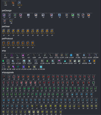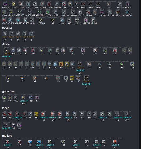 | 690 Diametrion, 370 IAC, 1100 ABR, 25k Trace, 530 Schizm, 5k Cerebrum, 1.4k Scrap, 15.5k Eternal frag
