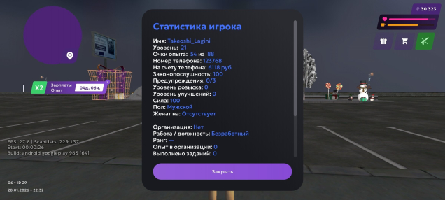 Краткое описание: 💜 Matreshka RP 06 💜 21 LVL | 100.000 | 🎒Инвентарь | фулл скилл ⚡️