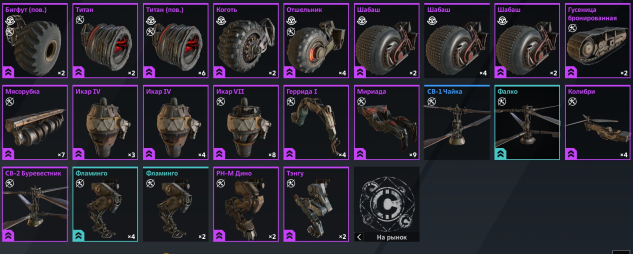 + ходовой на складе лежит побольше, чем на скриншоте из-за ограничения по количеству фото, лежат еще: улучшенные бигфуты, виджеты, увабаки и затворники.