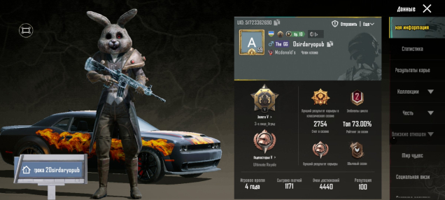 Подробное описание: додж, м24 килл чат, ледник 1лвл, 59 лвл акка, 37 лвл коллекции, прокачеваемый уаз, есть мк14, м416, много мификов