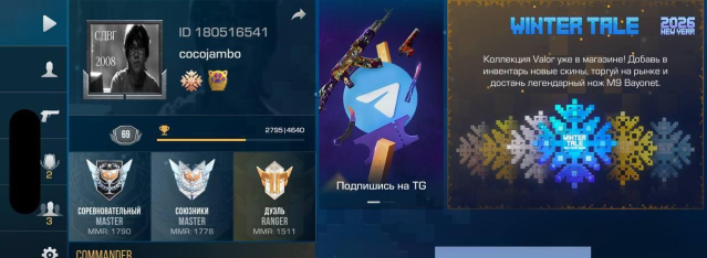 хороший аккаунт с купленным новым пассом который полностью прошел, лутанул хороший ножик оттуда, на втором скрине можно увидеть, что у меня мастер в мм и союзе, так же на акке есть гифтбокс, новые кейсы, новые паки, и есть пак найтмар, так же есть личный клан