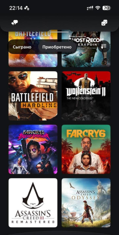 на аккаунте имеюттся игры такие как: watch dogs legion, mirrors edge, battlefield 1,4,5,hardline, dying light 1, sniper elite 2,wolfenstein 1-4, mafia 1-3, resident evill 7, far cry blood dragon, 6, assassin s creed 3, odyssey