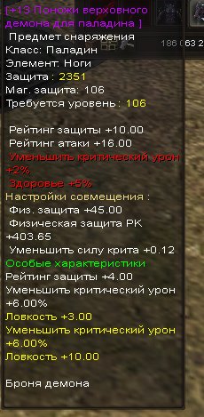 Сервер: Азмара-БлэкФорестКраткое описание: Поножи паладина 106+13 12% уменьшения критического урона