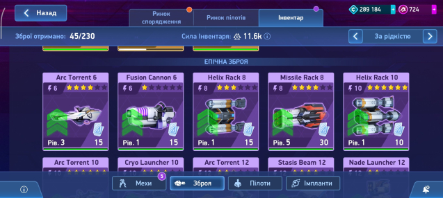 Weapons: 6⭐ EM rifle 16, graviton beam 16, railgun 12, helix rack 10, arc torrent 10, 5⭐ carbine 8, 4⭐ disc launcher 12, arc torrent 6, missile rack 8, cryo launcher 10, stasis beam 12, fusion cannon 12