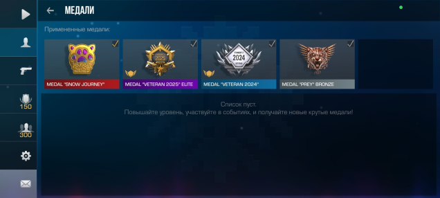♥️➡️МЕДАЛИ Medal «Snow Journey»; Medal «Veteran 2025» Elite Gold; Medal «Veteran 2024» Silver; Medal «Prey» Bronze