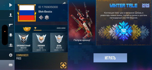 Звание: EliteКраткое описание: Акаунт старый 2 ножа перчатки калашь Мка
