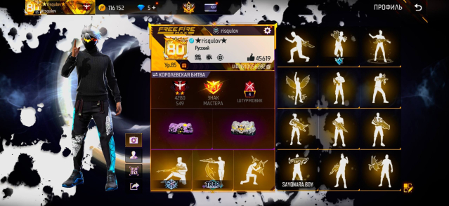✅ 840+ торсов 💅 ✅ 6 супер костюмов ✅ 190+ эмоций 🤠 ✅ 5 фолиантов ✅ 3 превращения 😶🌫️ ✅ 19 появлений в лобби ✅ 11 скайджетов 🏴☠️ AURA ✅ 202+ сумок 🎒 ✅ С создания аккаунта почти все пропуски и BOOYAH PASS 💸 ✅ Чёрная водолазка ⬛️ ✅ Синие 💙, красные и зелёный (М/Ж) ✅ Все олд футболки 👕 ✅ Зомби самурай 🆘️ ✅ Все лучшие причёски 💇♀️💇♂️ ✅ Синий и жёлтый Инь-Янь (М) 🌟 ✅ Душа звезды 🤩 ✅ Саске и его клинок 🗡️ ✅ Все наборы DEVIL MAY CRY 🦹🏼 ✅ Набор Актёр Шен 🪼 ✅ Набор Бумажный крокодил 🐊 ✅ Набор Проекция пламени 🖤 ✅ Чёрная и Огненный солдат маски 🌠 ✅ Много женских костюмов ✅ Уникальные события ✅ ЗОЛОТОЙ САМУРАЙ 🏆 ✅ ЗОМБИ САМУРАЙ 👹 ✅ Клоны 🤡 ✅ Инкубатор Огненный солдат — ФУЛЛ ☄️ ✅ Заяц отчаяние 👺 ✅ Красная тень (фулл) 🦸🏽♂️ ✅ ТОП ПРЕСТУПНИК — ФУЛЛ ✅ Бронированный Титан 🛡️