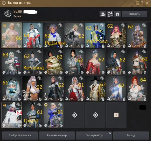 24 перса + 2слота пустых. Твины раскиданы по босикам и т.д. Уровни персонажей в среднем 62 (на скрине красным)