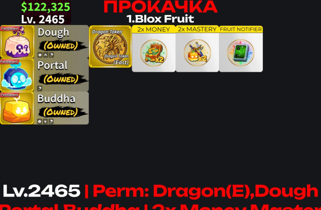 ⚡️ ПОЛНЫЙ ДОСТУП ⚡️ G ⚡️ BF ⚡️ Lv.2465 ⚡️ Perm:Dragon(E),Dough,Portal,Buddha ⚡️ Fruit Notifier ⚡️ СМОТРИТЕ ОПИСАНИЕ ⚡️Пол: Мужской