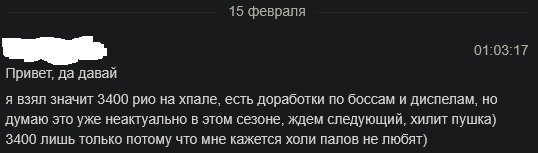 Выбирайте вариант, который подойдет Вам по соотношению «цена-качество», уточняйте в ЛС вопросы — мы свяжемся с игроками, проверим условия, актуальность и доступность предложений и поможем провести максимально безопасную сделку.