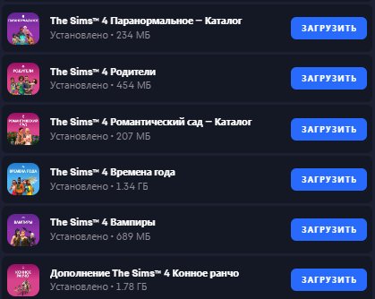 🔵 На аккаунте куплены дополнения: На заднем дворе — каталог | Комнатные растения — комплект | Жизнь в городе | Путь к славе | На работу! | Веселимся вместе! | Жизнь на острове | Паранормальное каталог | Родители | Романтический сад — каталог | Времена года | Вампиры | Конное ранчо |