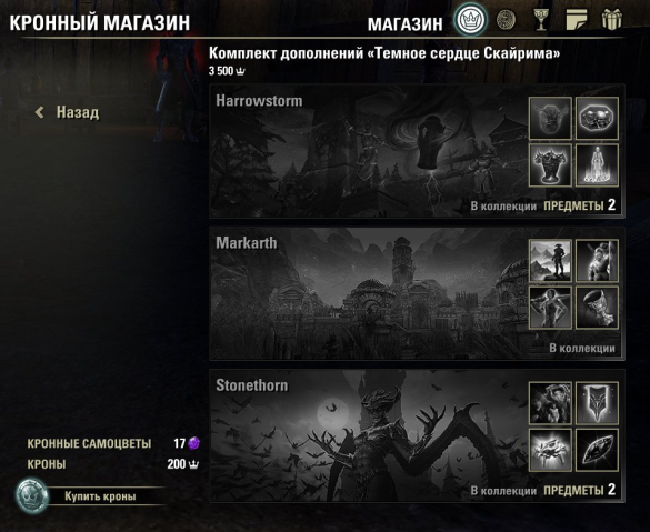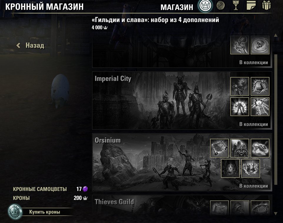 В коллекции есть всякие маунты из коробок, двемерский волк из механики археологии, скелет-волк за 400 гемов и тд; куплена самая важная вещь за 2кк голды — личность пьяницы(!); штуки 4 скинов, 2 полиморфа, всякие украшения.....