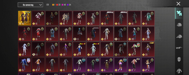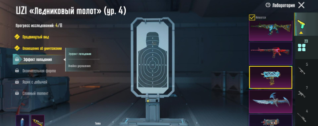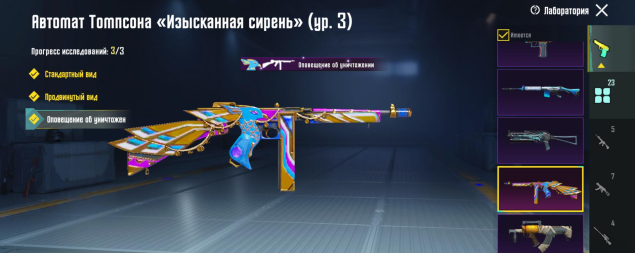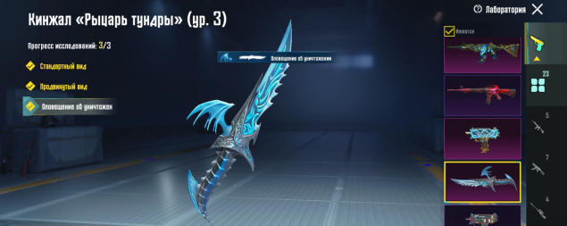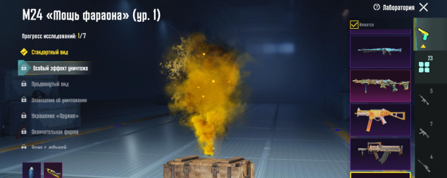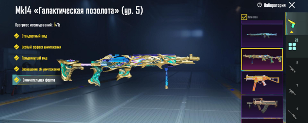 M416 Разрывающий рев 4 лвл, УЗИ Ледниковый молот 4 лвл, Mk14 Галактическая позолота 5 лвл, Томпсон 3 лвл, Кинжал 3 лвл, Гроза Тыква 2 лвл, 23 оружия, все остальное — 1 лвл