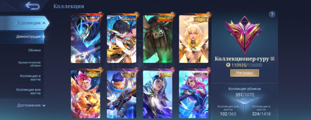 На аккаунте находиться 351 скинов. ГОССЕН легендарный, Грейнджер Коллектор, Тамуз Кунг Фу Панда, 2 Прайм Облика — Беатрис и Грейнджер, Руби Аспирант и другие топовые облики.
