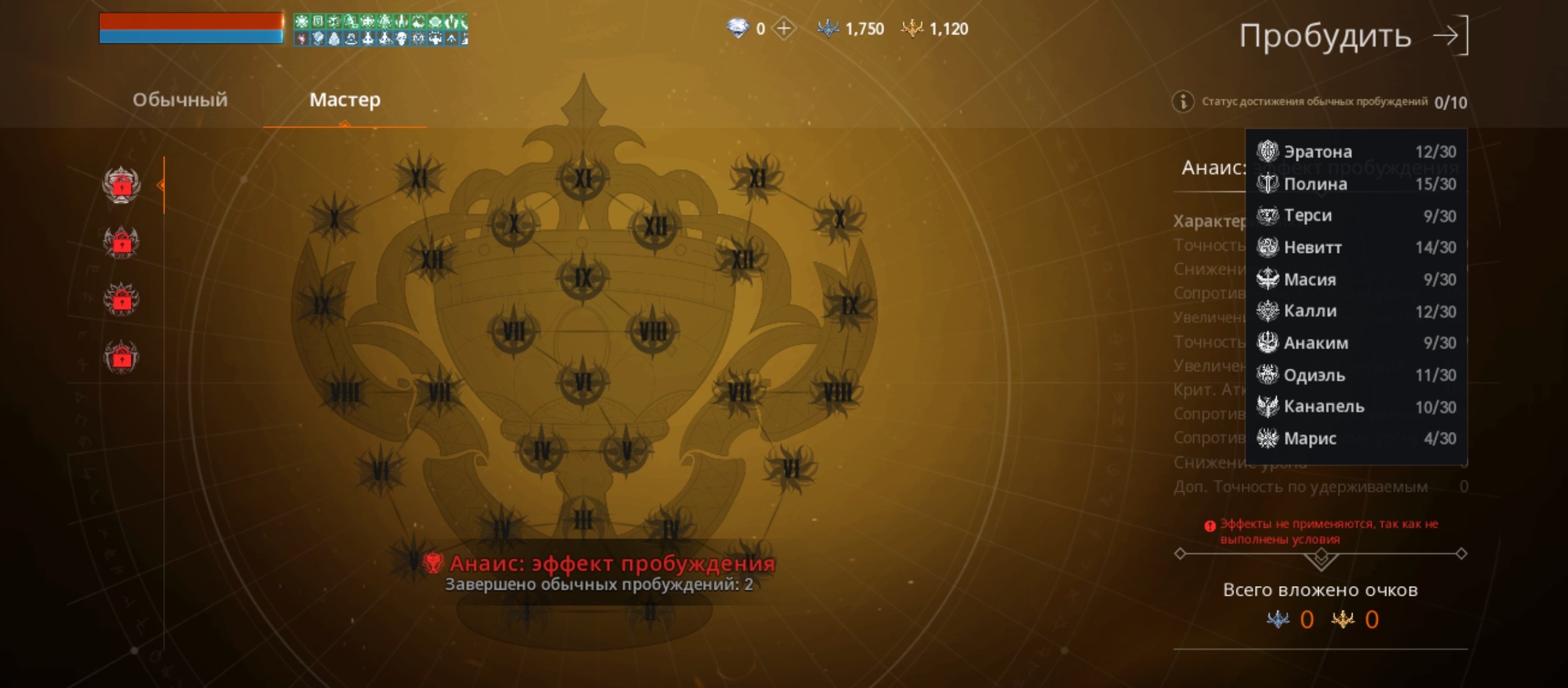 Пробуды 13/30+скилл, 16/30+скилл, 9/30, 16/30+скилл, 9/30, 12/30, 10/30+скилл, 11/30, 10/30, 4/30