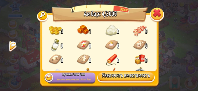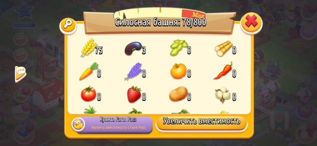 Краткое описание: ⚡52 LVL⚡139.000 МОНЕТ, 122 АЛМАЗА⚡АМБАР 3000, СИЛОСНАЯ 800⚡