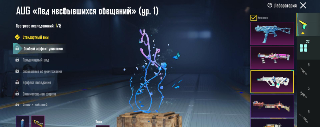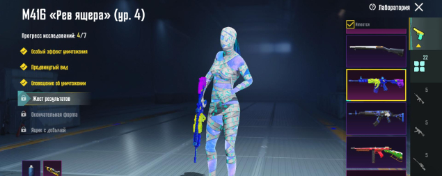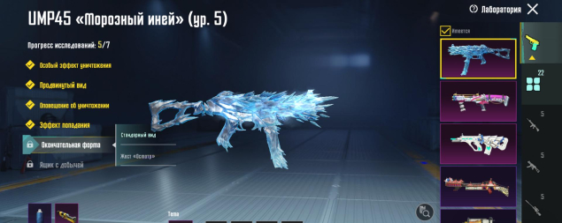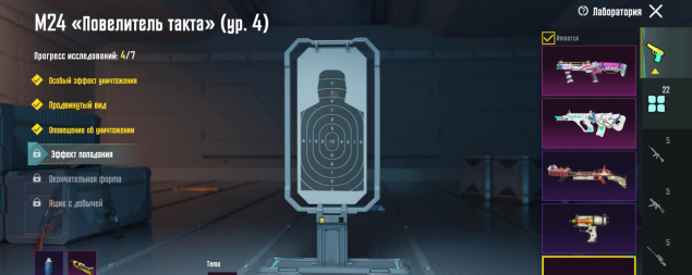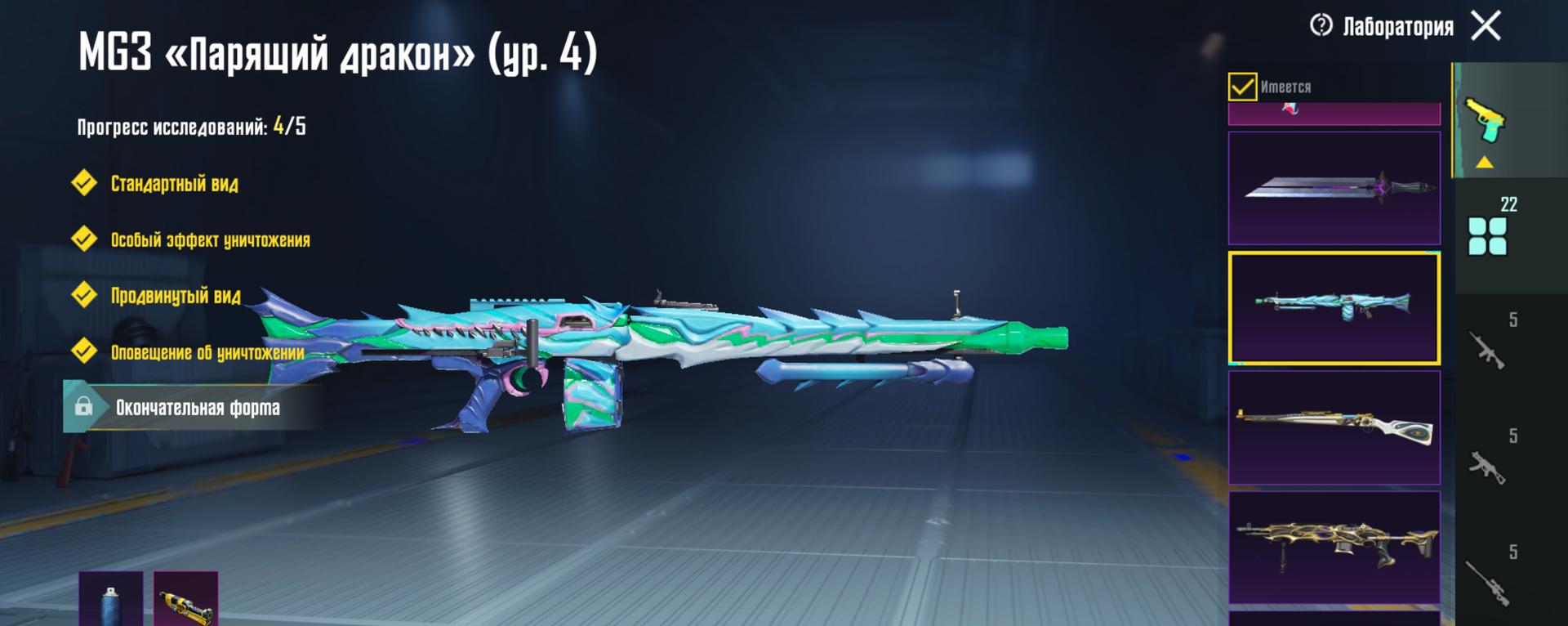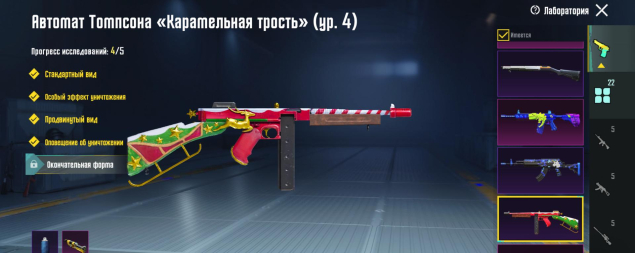 M416 Рев ящера 4 лвл, UMP45 Морозный иней 5 лвл, Томпсон Карамальная трость 4 лвл, MG3 Парящий дракон 4 лвл, M24 Повелитель такта 4 лвл, ДБС 3 лвл, ЮМП 3 лвл, Арбалет 2 лвл, 22 оружия