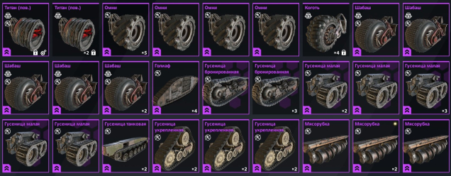 Практически все популярные кабины апнуты на топ статы (некоторые в двух вариациях: для ховеров и для колес/пауков/шнеков). почти все модули апнуты топ статы, топ аппы на и красных синих ховров (два набора топ аппов под разные крафты), т, куча аппов на герриды, мясорубки, мнл, шабаши, бигфуты, титаны, затворники и многое другое.