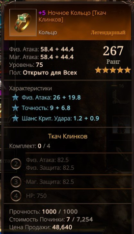 Подробное описание: Сетовый бонус Ткач клинков и установленные камни дает больший прирост физического урона даже чем у колец 100 уровня+5, что позволяет использовать их в дальнейшем даже после получения персонажем 100го уровня.