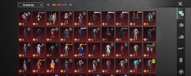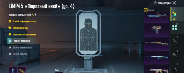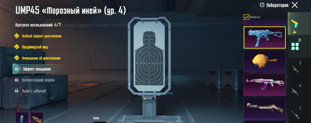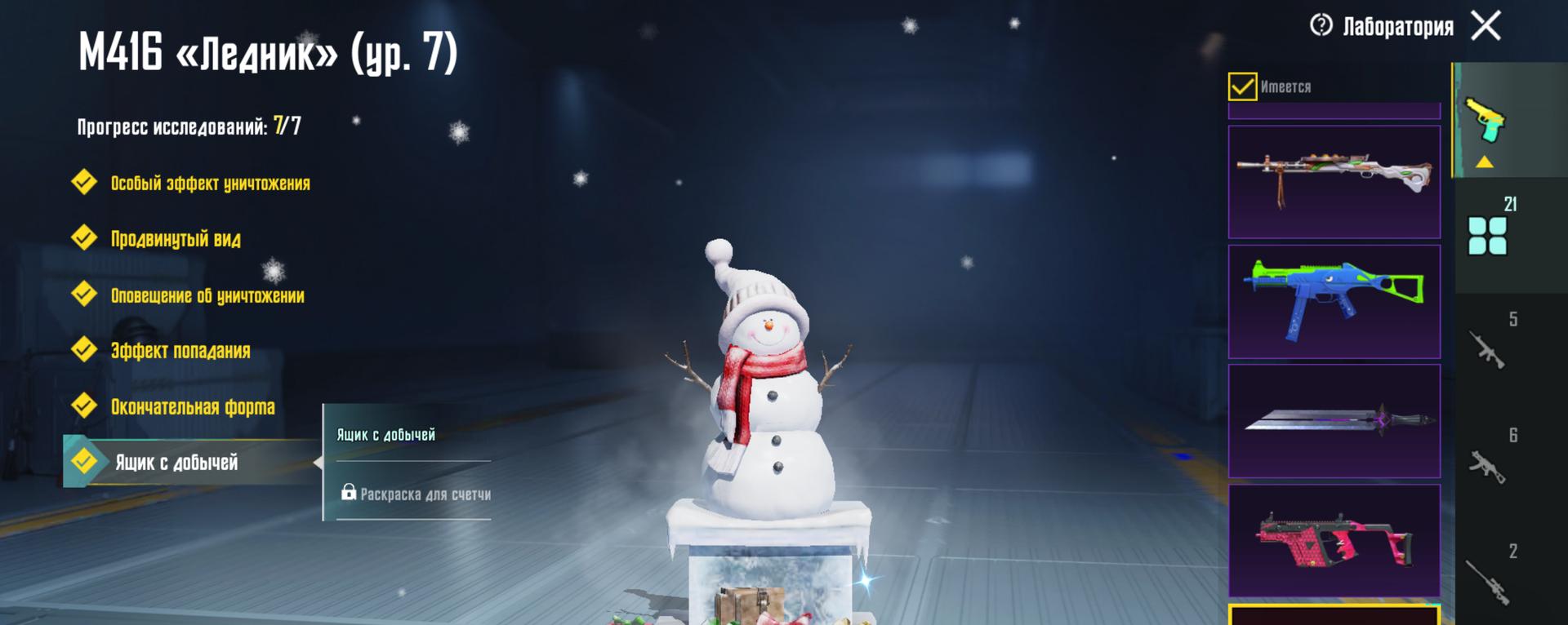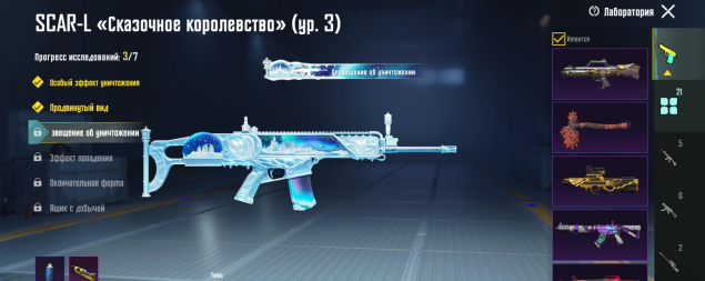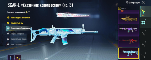 M416 Ледник 7 лвл, UMP45 Морозный иней 4 лвл, SCAR-L Сказочное королевство 3 лвл, всё остальное — 1 уровень, 21 оружие всего