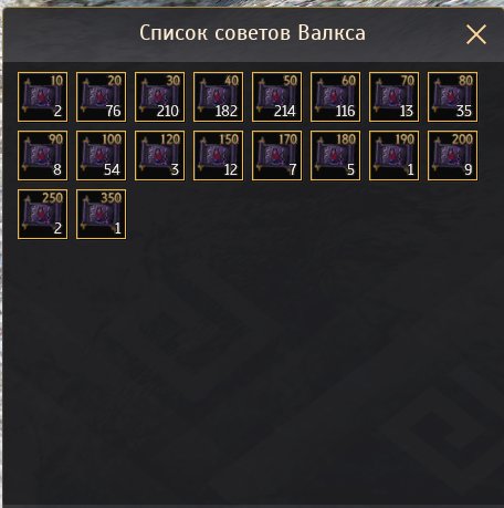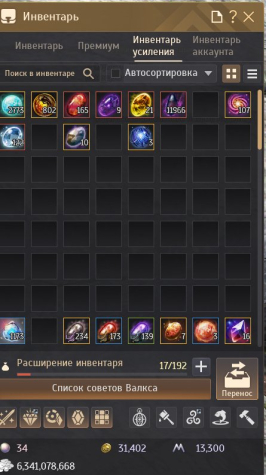 Бесконечное количество камней как инкрустаций так и в реликвии. Апнутые релики Декии и Кабуа, стоят бис камни. 185 рабочих гоблинов, 13700 квестов, неимоверное количетсов всяческих квест айтемов, внешек и прочего кала. Забиты склады ивент айтемами и прочим. Через 100 осколков скрафтится Вальтрон.
